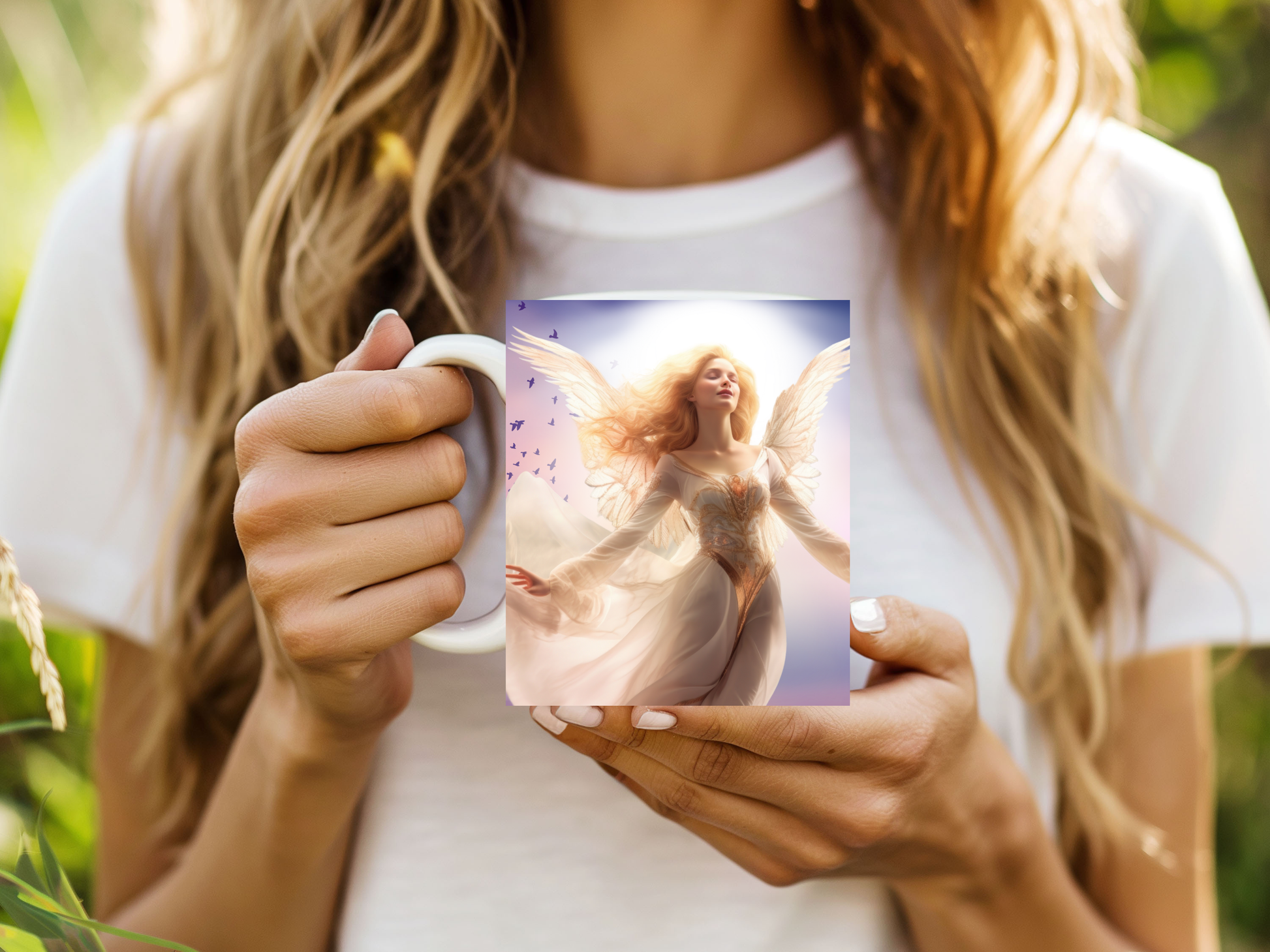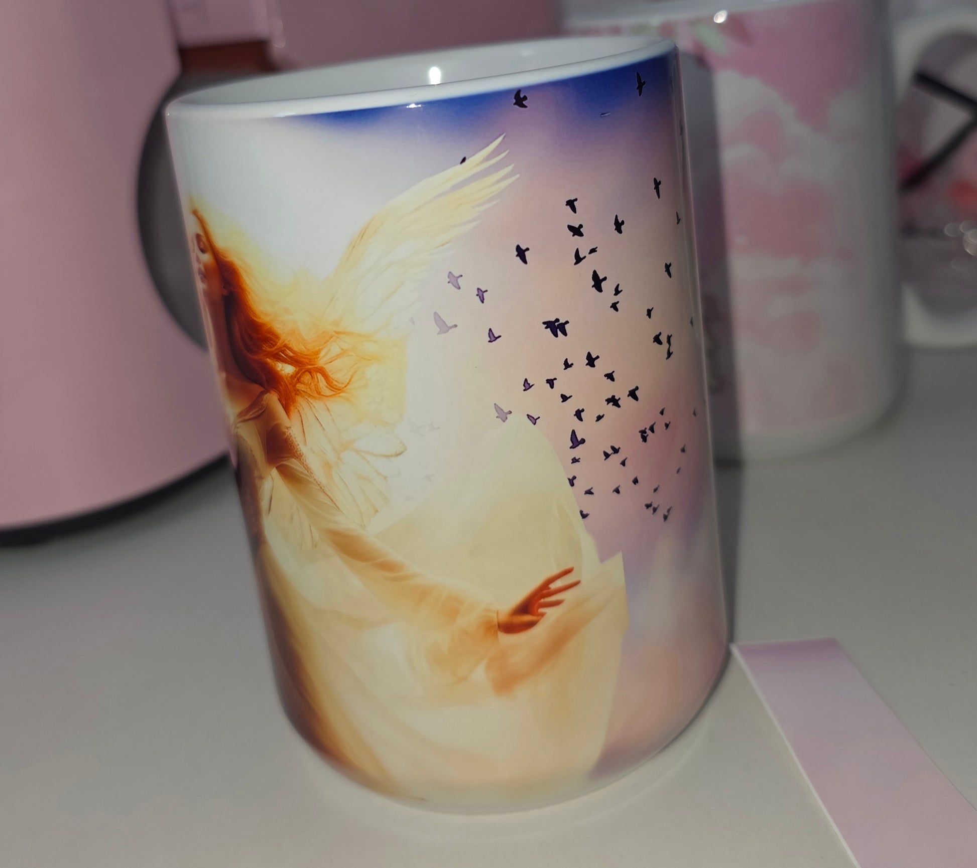 Step into a realm where the skies sing in soft pastels and an angel dances on the breeze. "Celestial Grace" captures the essence of divine beauty — a radiant winged woman floating in serenity, her golden hair kissed by light, surrounded by soaring birds and a heavenly glow. A mug for dreamers, believers, and those who carry light in their soul.