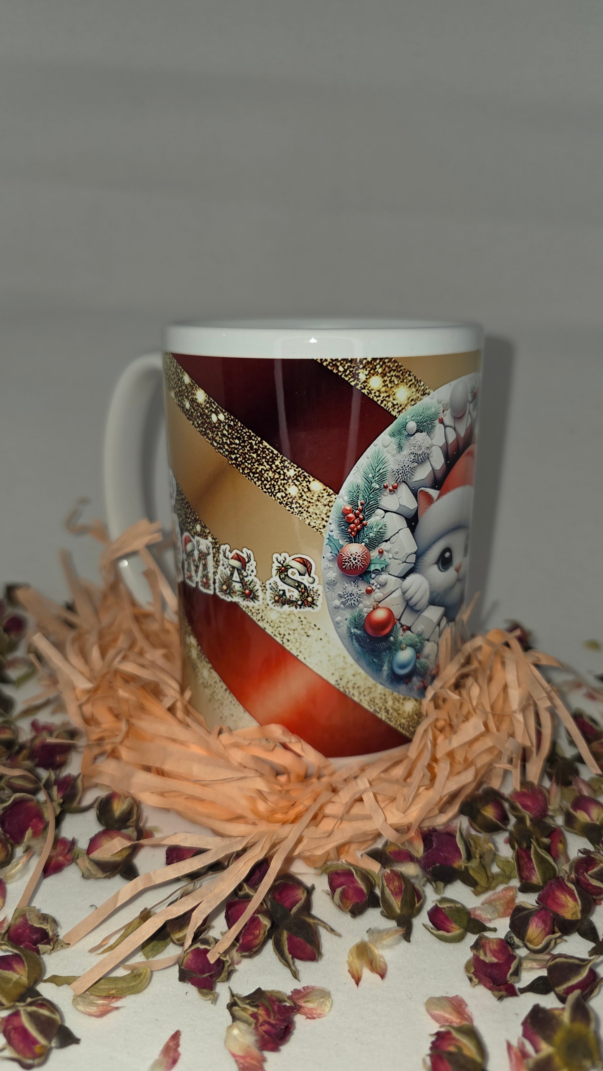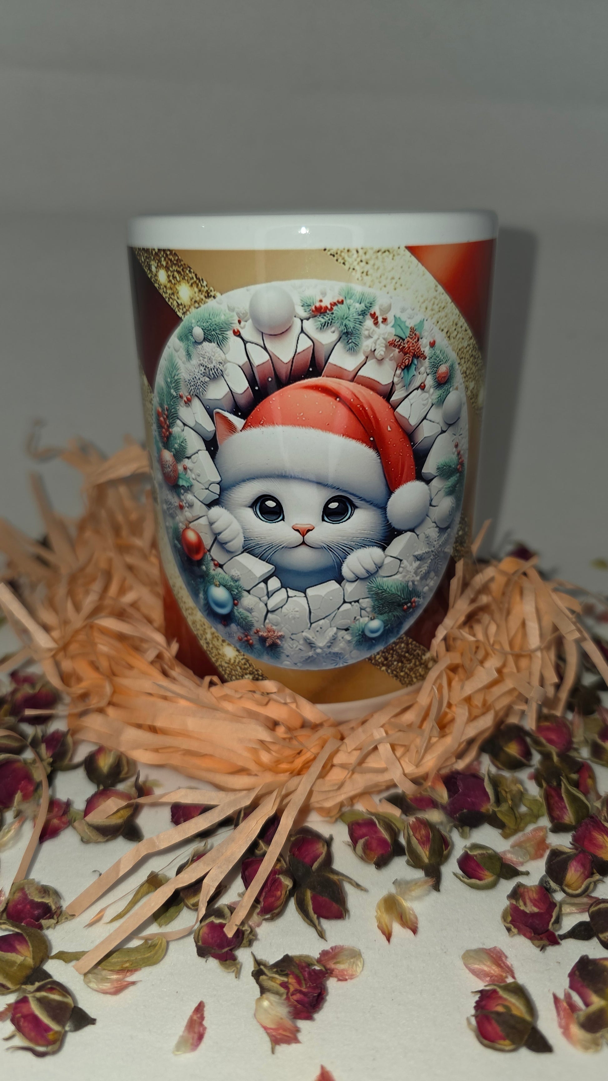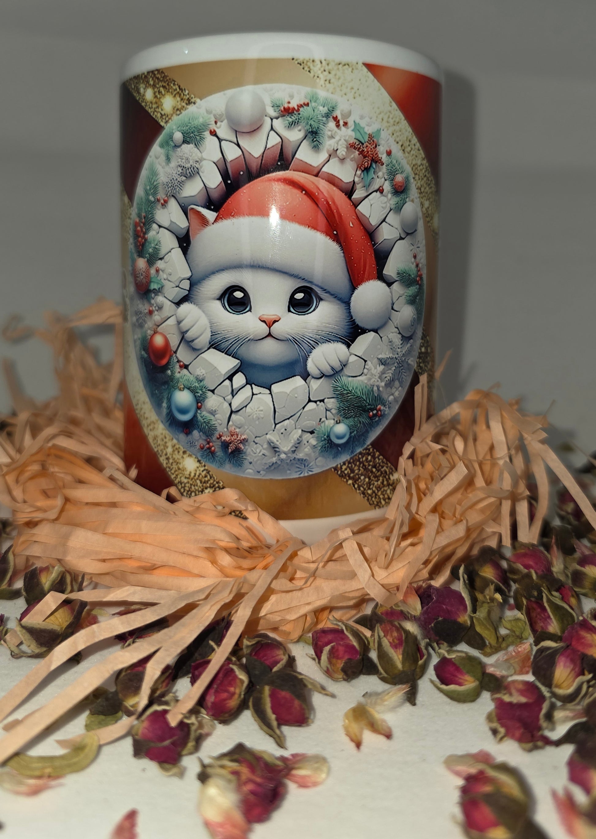 Add a touch of sparkle to your holiday mornings! “Winter Whisker Magic” features a cute Christmas kitty wrapped in a frosty wreath, surrounded by glittering gold and festive red. Every sip brings warmth, joy, and a sprinkle of holiday wonder. Perfect for cozy nights, cat lovers, and anyone who adores Christmas charm.