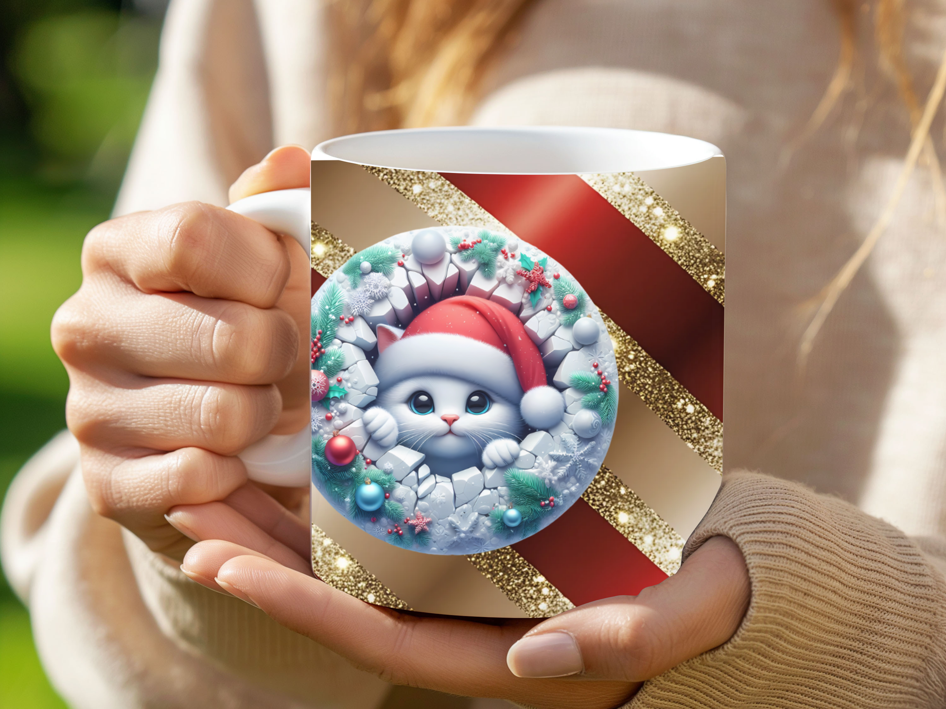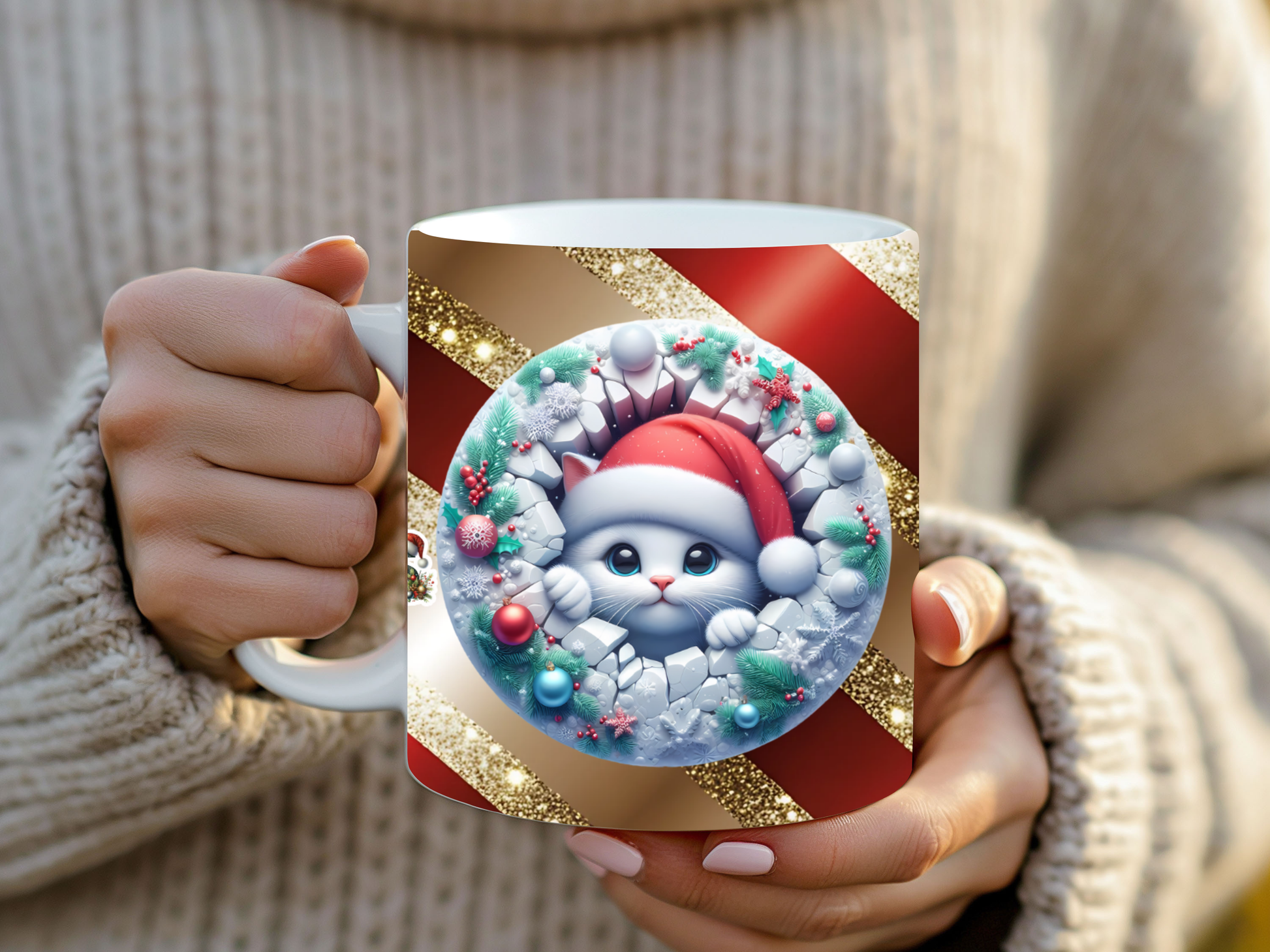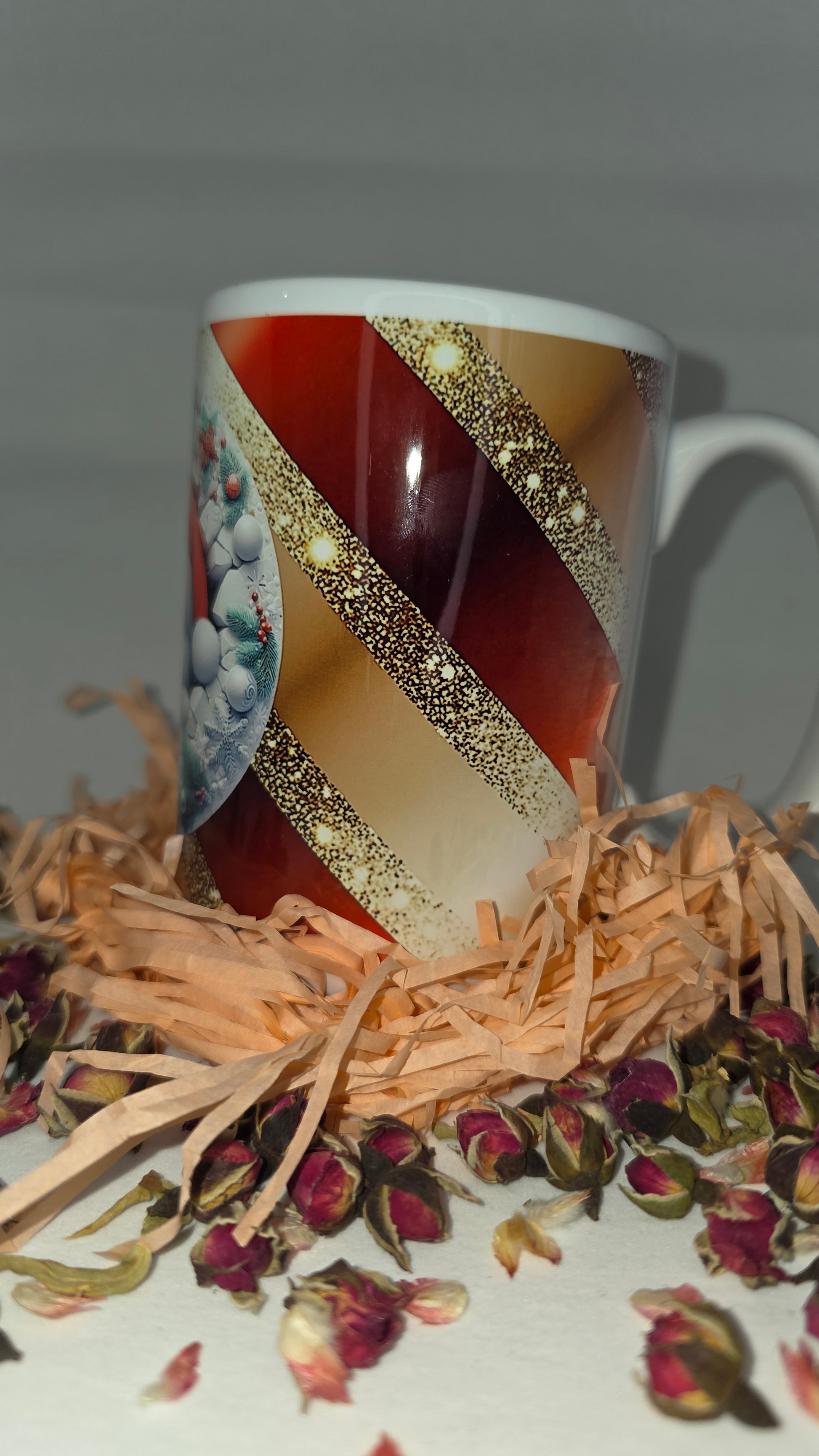 Add a touch of sparkle to your holiday mornings! “Winter Whisker Magic” features a cute Christmas kitty wrapped in a frosty wreath, surrounded by glittering gold and festive red. Every sip brings warmth, joy, and a sprinkle of holiday wonder. Perfect for cozy nights, cat lovers, and anyone who adores Christmas charm.